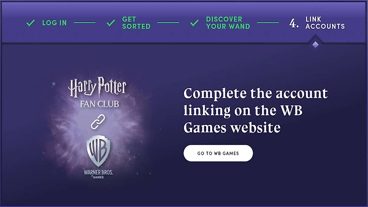 После определения факультета по тестированию на сайте привяжите аккаунт фан клуба Гарри Поттера к учетной записи WB Games. Для этого воспользуйтесь кнопкой «Go to WB Games». Чтобы все получилось, используйте VPN, иначе страница не будет отображаться и не получите легендарную палочку Дамблдора.