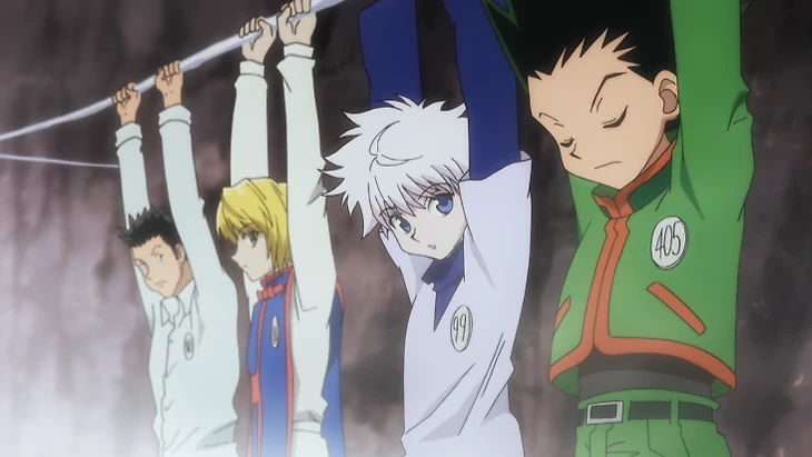 В начале истории Гон сразу же находит друзей: Леорио, доктор медицинских наук, чья цель – деньги. Курапика – единственный выживший из своего клана, который хочет отомстить. Киллуа – наследник семьи наемных убийц, ставший лучшим другом Гона и одним из главных героев аниме. Ребята вместе проходят экзамен на охотника, обучаются, помогают друг другу и сталкиваются с приключениями. Аниме включает в себя 148 серий и семь арок: «Экзамен на охотника», «Семья Золдик», «Небесная арена», «Йоркнью-сити», «Остров жадности», «Муравьи-химеры» и «Выборы председателя».