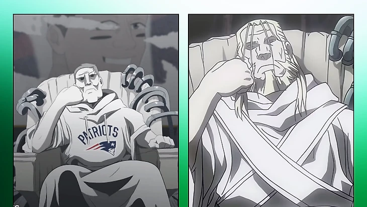 Билл Беличик – величайший тренер, который выиграл шесть Супербоулов и воспитал поколение крутых футболистов. А еще он постоянно носит модное худи! Беличик неслучайно оказался в «Стальном алхимике». Аниме уже несколько лет считается лучшим на агрегаторах оценок.