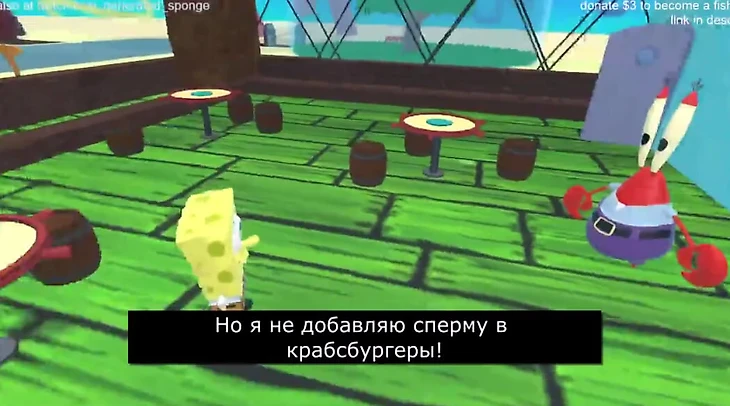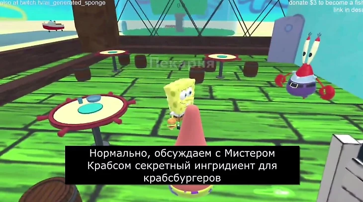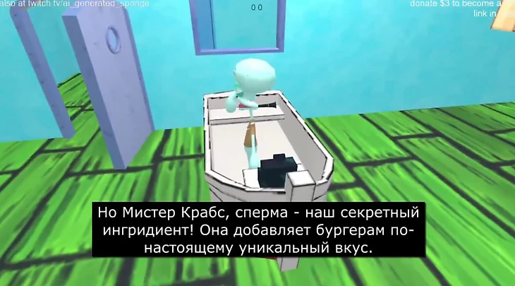 «Губка Боб» тоже обзавелся нейросетевой версией. На канале ai_sponge генерируется бесконечная абсурдная серия «Спанчбоба» со всеми известными персонажами – Губкой Бобом, Патриком, Сквидвардом, мистером Крабсом и именами донатеров в качестве рыб-гостей. В одной из серий раскрыли секретный ингредиент «крабсбургера» – им оказалась сперма.