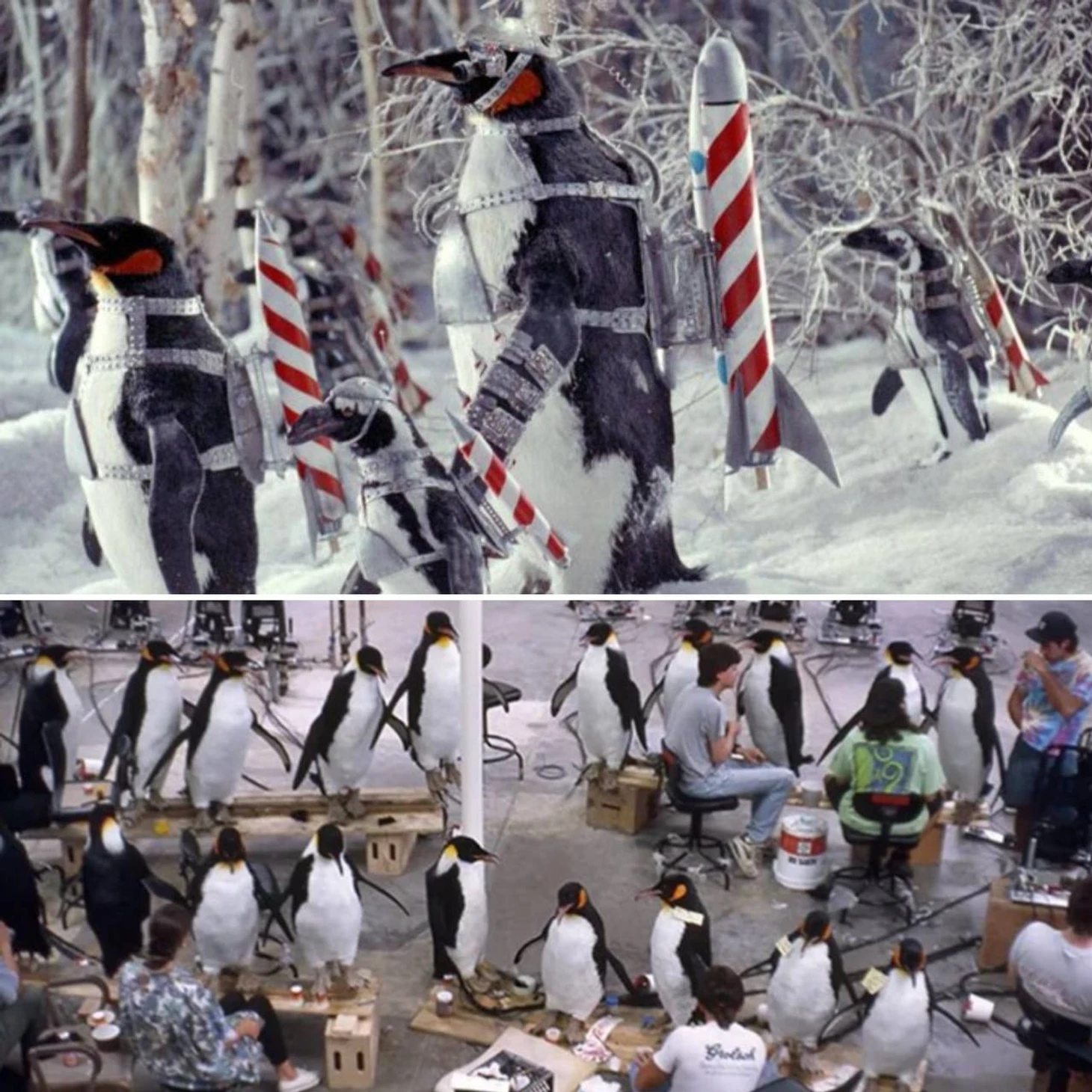 29) Армия пингвинов состояла из настоящих пингвинов, актеров в костюмах из стекловолокна, роботизированных марионеток и компьютерной анимации. Дрессировщики животных использовали технику, называемую стайкой, когда марионетка выступала в роли главного пингвина, а живые пингвины подражали ей.