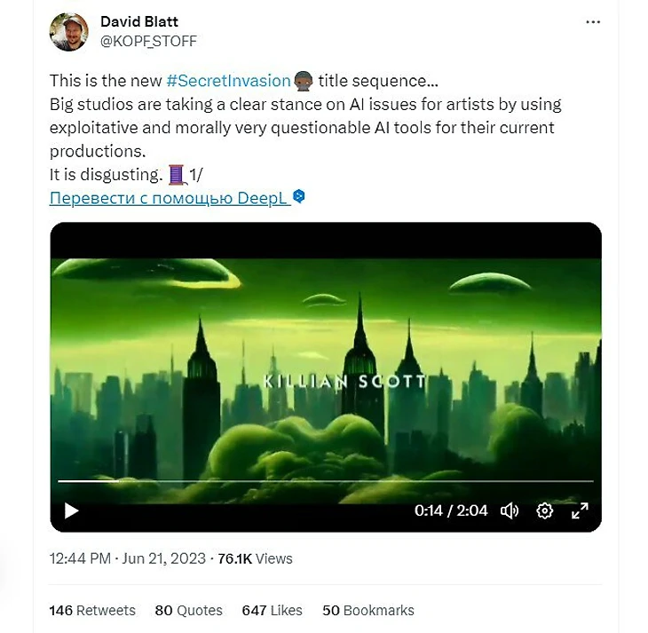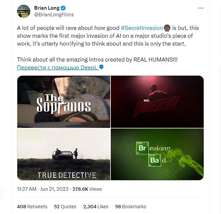 «Это заставка «Секретного вторжения»... Большие студии заняли четкую позицию касаемо проблемы замены художников ИИ. Они используют эксплуататорские и сомнительные с моральной точки зрения инструменты ИИ для своих текущих работ. Это отвратительно».