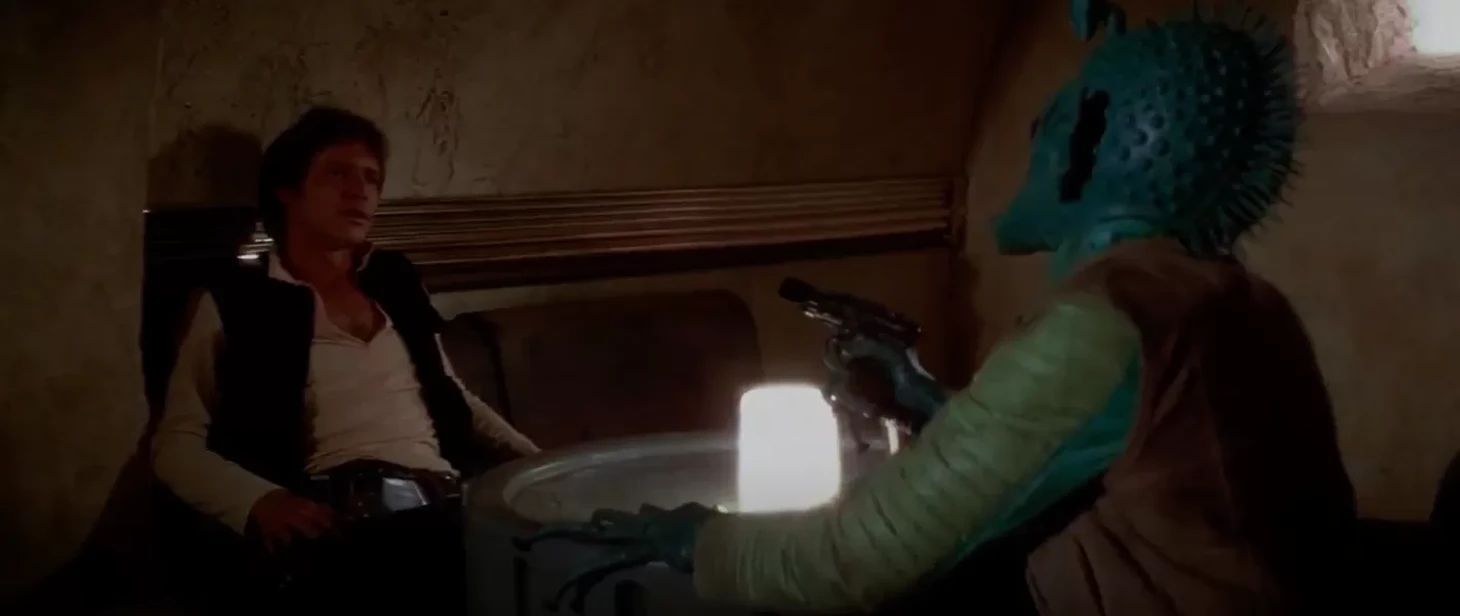 Спустя несколько лет после релиза Джордж Лукас посчитал, что характер Соло не позволит ему выстрелить первым. «Я думал мифологически – должен ли он быть ковбоем или Джоном Уэйном?» –говорил Лукас, имея в виду выбор между образом хладнокровного убийцы и образом благородного-убийцы.