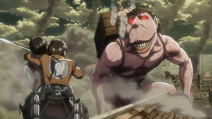 Эрен решает вступить армию, чтобы стать разведчиком и уничтожить всех титанов. Спустя несколько лет на новый город нападают титаны и прорывают оборону, но среди них появляется странный титан, который почему-то убивает других. Как бы это не было бы иронично, но им оказывается Эрен, который получилось силу Атакующего титана, способного защитить человечество.
