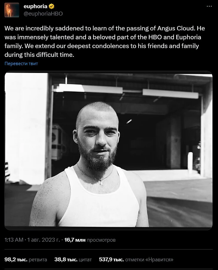 Вечером 31 июля стало известно о смерти актера Ангуса Клауда, известного по роли Феско в «Эйфории». Он умер в своем доме в Окленде, в Калифорнии. Мама актера обнаружила его мертвым.