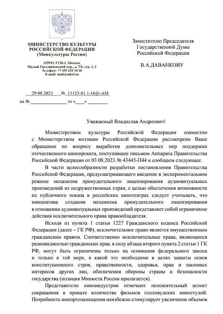 Минкульт РФ считает, что принудительное лицензирование голливудских фильмов – скорее вредная практика, чем полезная.