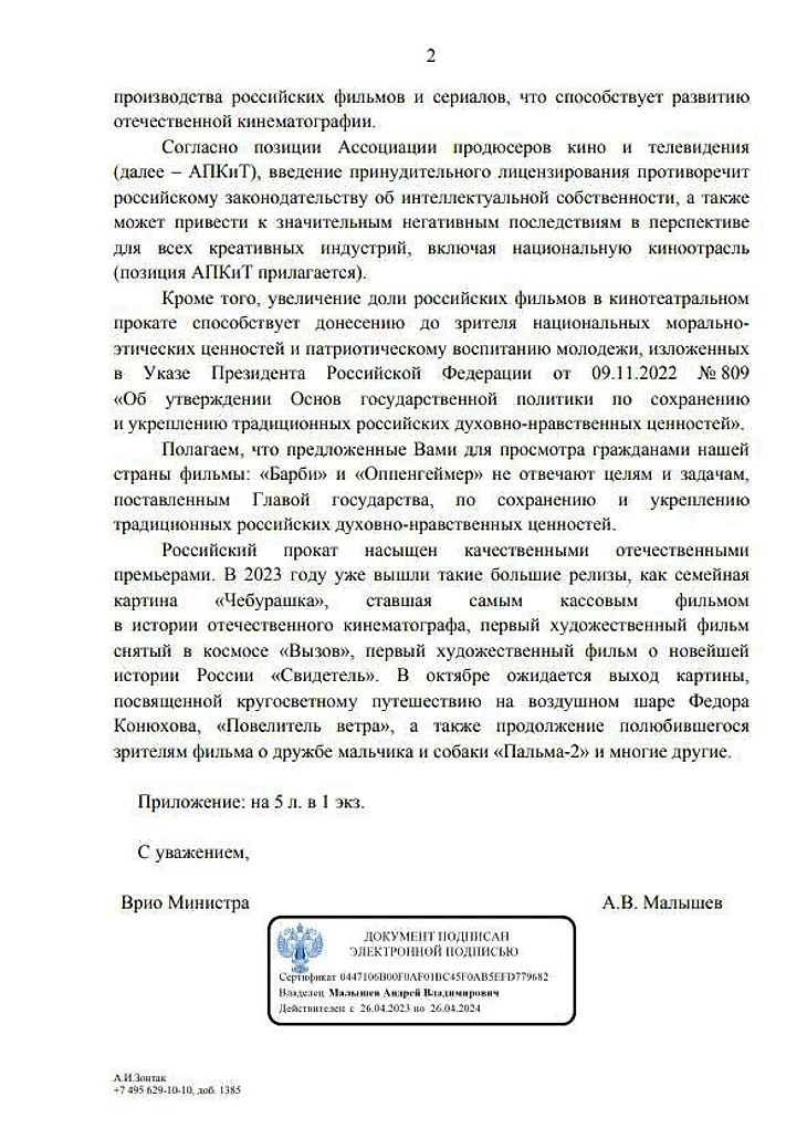 Вот и все, ни слова про «запрет». Просто Министерство культуры не считает целесообразным запихивать два крупнейших кинорелиза лета 2023-го в российские кинотеатры против воли правообладателей.
