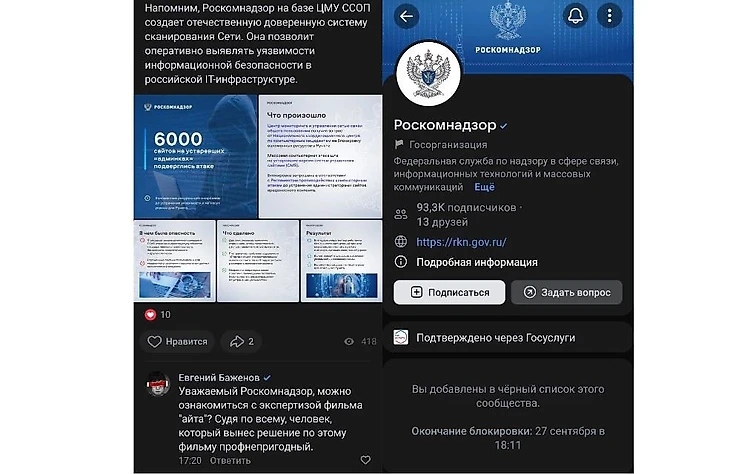 Баженов спросил о причинах запрета показа фильма в официальном сообществе РКН, после чего его внесли в черный список в VK.