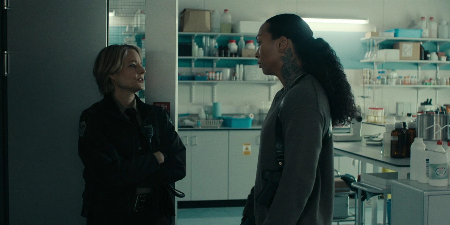 Классический формат с двумя совершенно разными героями все еще работает. Дэнверс – белая женщина постарше, воспитывает дочь, судя по всему, от погибшего в автокатастрофе мужа. Она властна, жестко обращается с подчиненными и наверняка успешна в профессии. Ее играет Джоди Фостер, которая моментами словно возвращается к роли Кларисы Старлинг из «Молчания ягнят», благо вырванные языки есть и там и там.