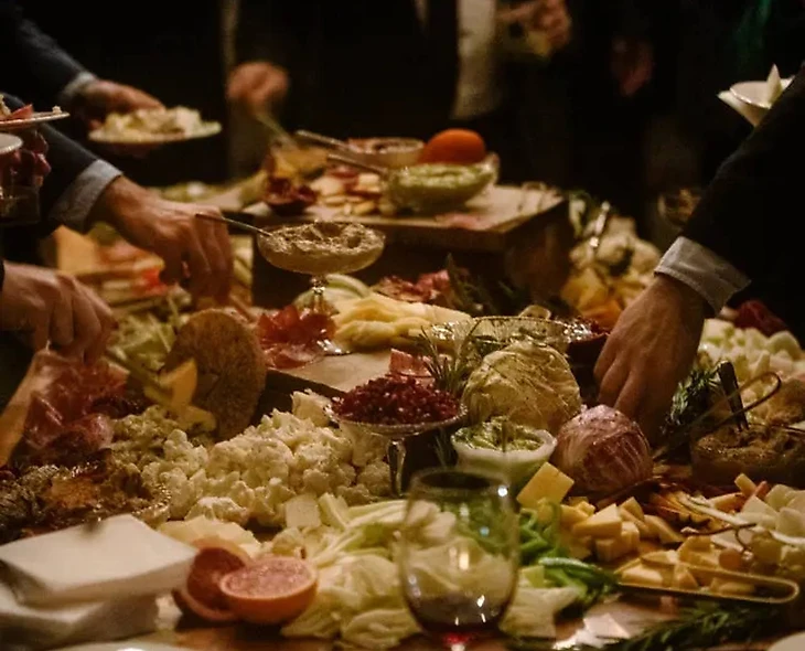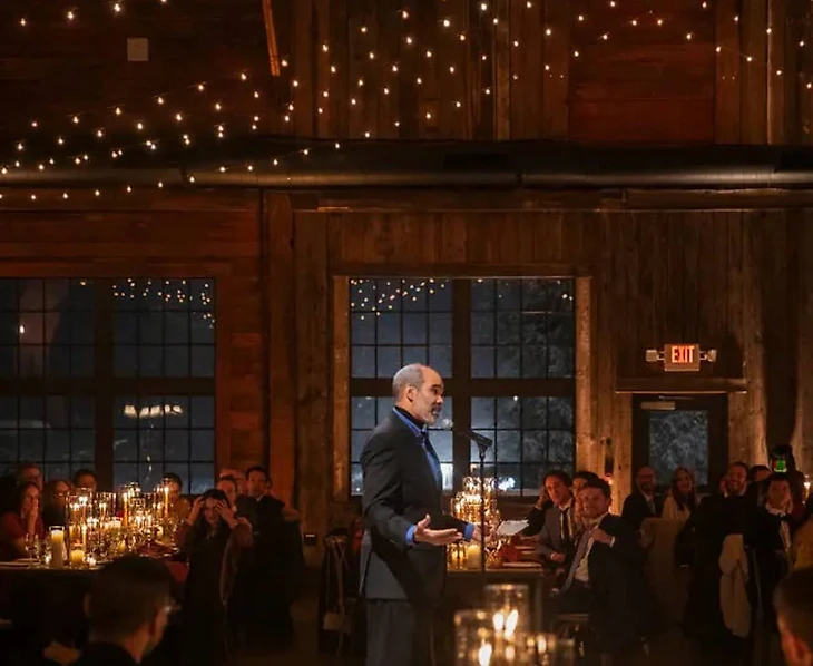 В освещенном свечами доме начался прием. Девять групп из друзей и родственников говорили поздравительные речи, пока за окном падал снег. Около 22:30 сотрудник площадки сделал заявление: из-за метели дороги непроходимы, и всем придется остаться здесь ночевать. В их число входили гости, 10 участников обручальной церемонии, организаторы мероприятия, сотрудники заведения, а также репортер и фотограф The New York Times. Места хватило всем, как иначе?
