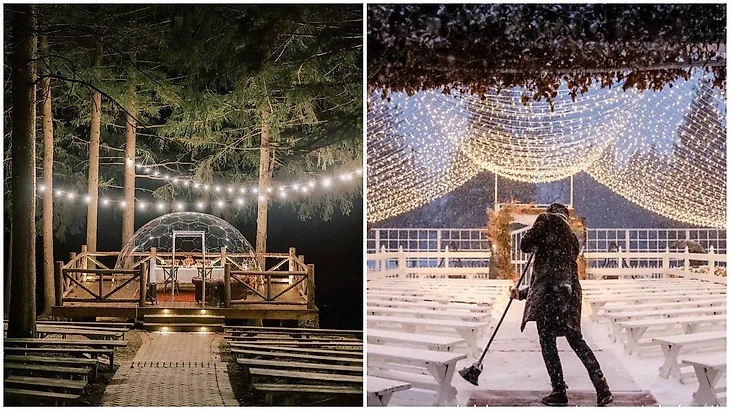 Пока гости оттаивали у большого внутреннего камина, невеста укладывала засыпанные снегом волосы, а жених, впервые официально выступая в роли мужа, опустился на колено у ее ног и согревал их феном. Гости в это время так же приводили себя в порядок и отогревались у импровизированных костров в уютных зонах с коктейлями.