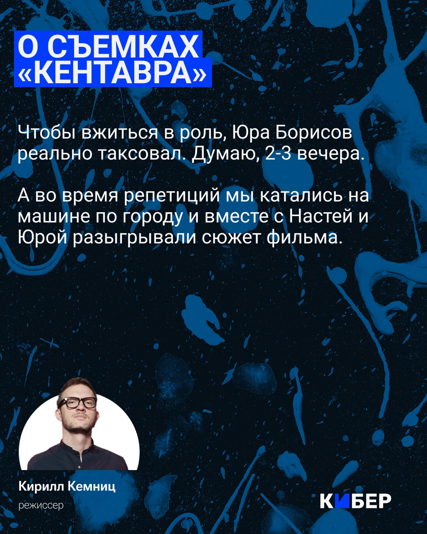 – Есть актеры, которые приходят на съемки и спрашивают «Что играть?». С Юрой все иначе: он продумывал образ, вносил предложения. Чтобы вжиться в роль, он даже реально таксовал. Не знаю сколько, думаю, 2-3 вечера. А во время репетиций мы катались на машине по городу и вместе с Настей и Юрой разыгрывали весь сюжет фильма.