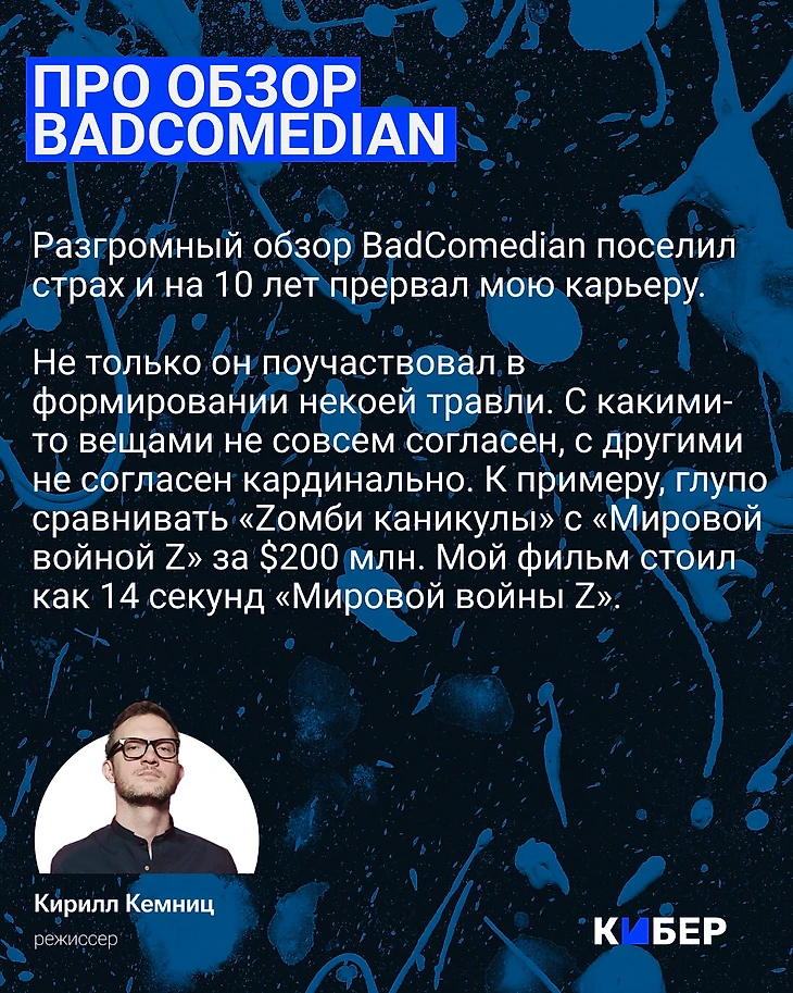 – Вообще к BadComedian отношусь нормально. Не только он поучаствовал в, скажем так, формировании некоей травли. С какими-то вещами совсем согласен, с другими не согласен кардинально. К примеру, глупо сравнивать «Zомби каникулы» с «Мировой войной Z» за $200 млн. Я даже посчитал: мой фильм стоил как 14 секунд «Мировой войны Z».