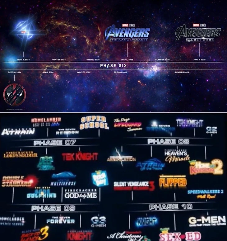 Это подробный список проектов до 10-й фазы, но со сцены отметили, что у них в планах еще 19 фильмов. Все это – хлесткая отсылка на фильмы Marvel и DC: тут есть «Люди G» и «Люди G: Через несколько дней после будущего» и своя Мультивселенная.