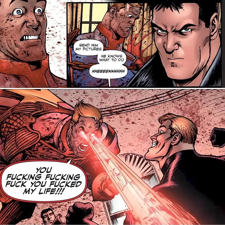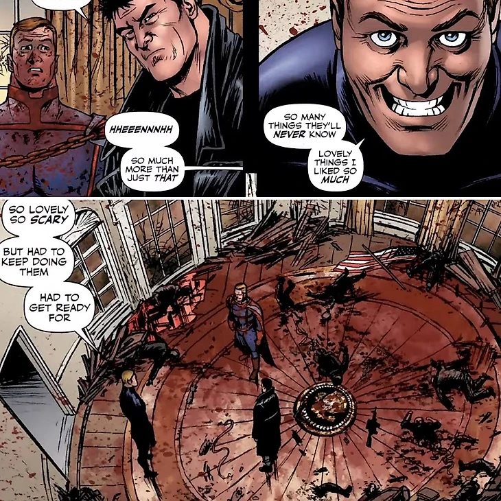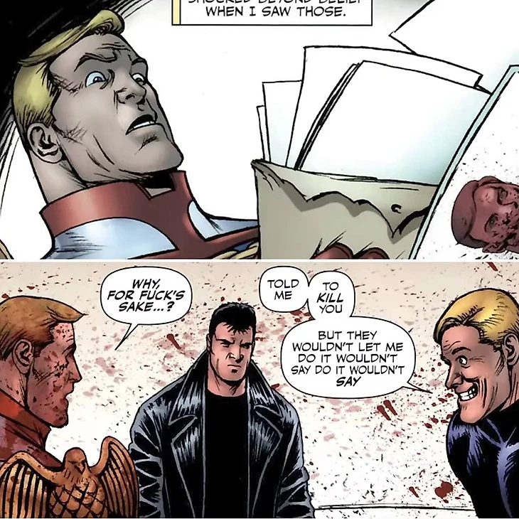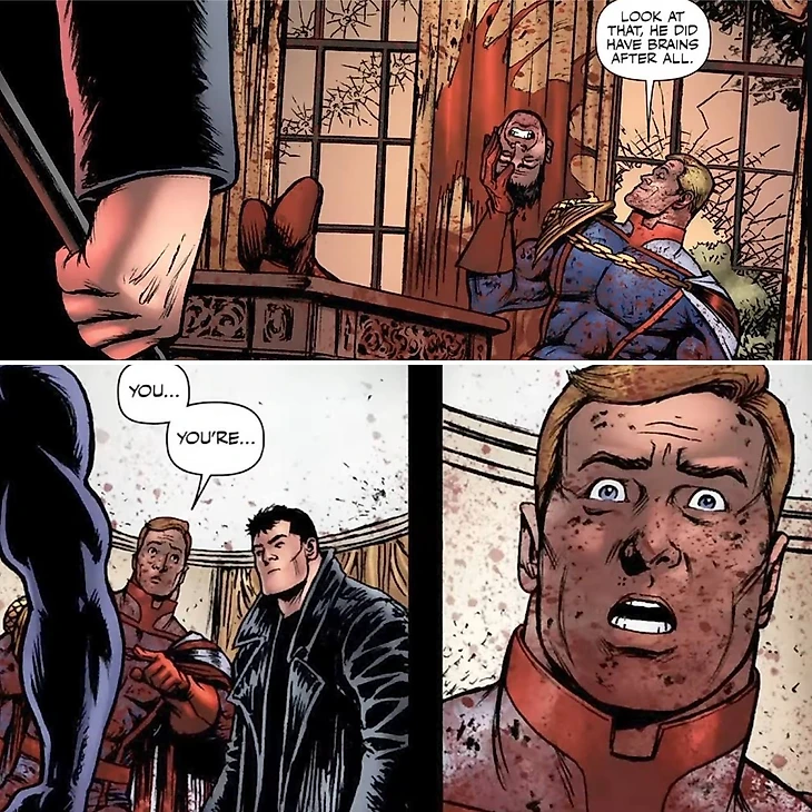 Бутчер давно вынашивал планы по уничтожению Хоумлендера и всех суперов – и после падения Белого дома он в бешенстве как никогда. Если в сериале Билли – очень сложный персонаж с системой моральных противовесов, то в комиксе все его решения обусловлены местью и неудержимым рвением восстановить порядок в США. Так Бутчер становится социопатом, который ничем не отличается от злодеев.