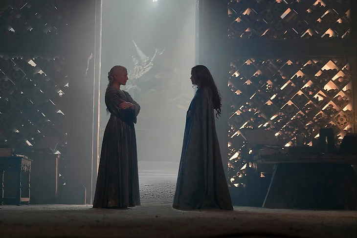 Давайте отметим, как создатели сериала точечно снимают отдельные мощные сцены. Даже такие, в которых происходит несусветная глупость. Скажем, диалог между Рейнирой и Алисентой — глупость? Да. Но как это стильно сделано! Актерская игра, выразительное разделение по краям экрана на общих планах, хоть и слишком академичное. Эмоции! Когда Рейнира произносит свое требовательное «выбирай», то жалость к Алисенте, даже если вы насквозь «очернели», ощущается физически.