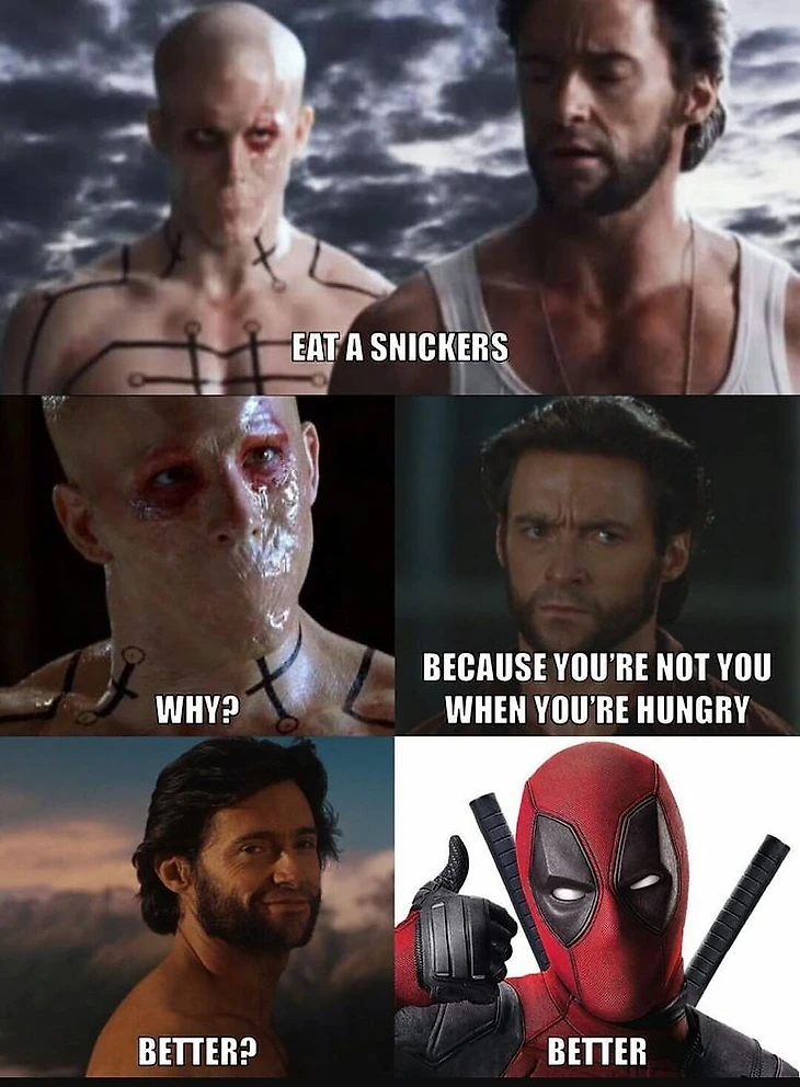 Именно этот феномен и отражает комикс, о котором идет речь. Он обыгрывает знаменитый слоган Snickers «Ты – не ты, когда голоден», превращая его в «Ты не Дэдпул, когда у тебя нет рта». Это отсылка к тому, как в фильме зашили рот Дэдпулу, лишив его возможности говорить.