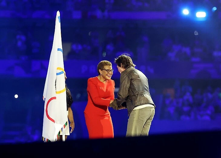 Конечно, передать флаг Олимпиады городу-Голливуду мог только самый атлетичный и храбрый американский актер современности, самостоятельно выполняющий трюки, – Том Круз. Любуемся его неудержимой харизмой.