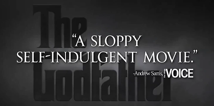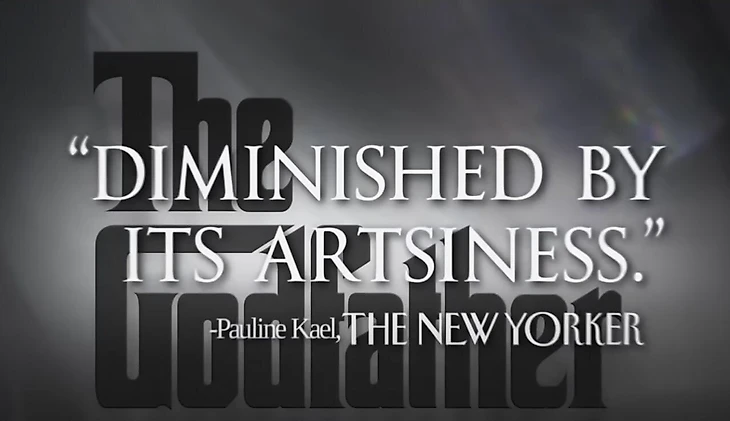 Например, можно было увидеть цитату великой рецензентки Полин Кейл: «Ограниченный собственной претенциозностью». Заявлялось, что эта формулировка вырвана из ее рецензии на «Крестного отца». Но на самом деле в оригинальном тексте вы ее не найдете: Полин Кейл обожала «Крестного отца».