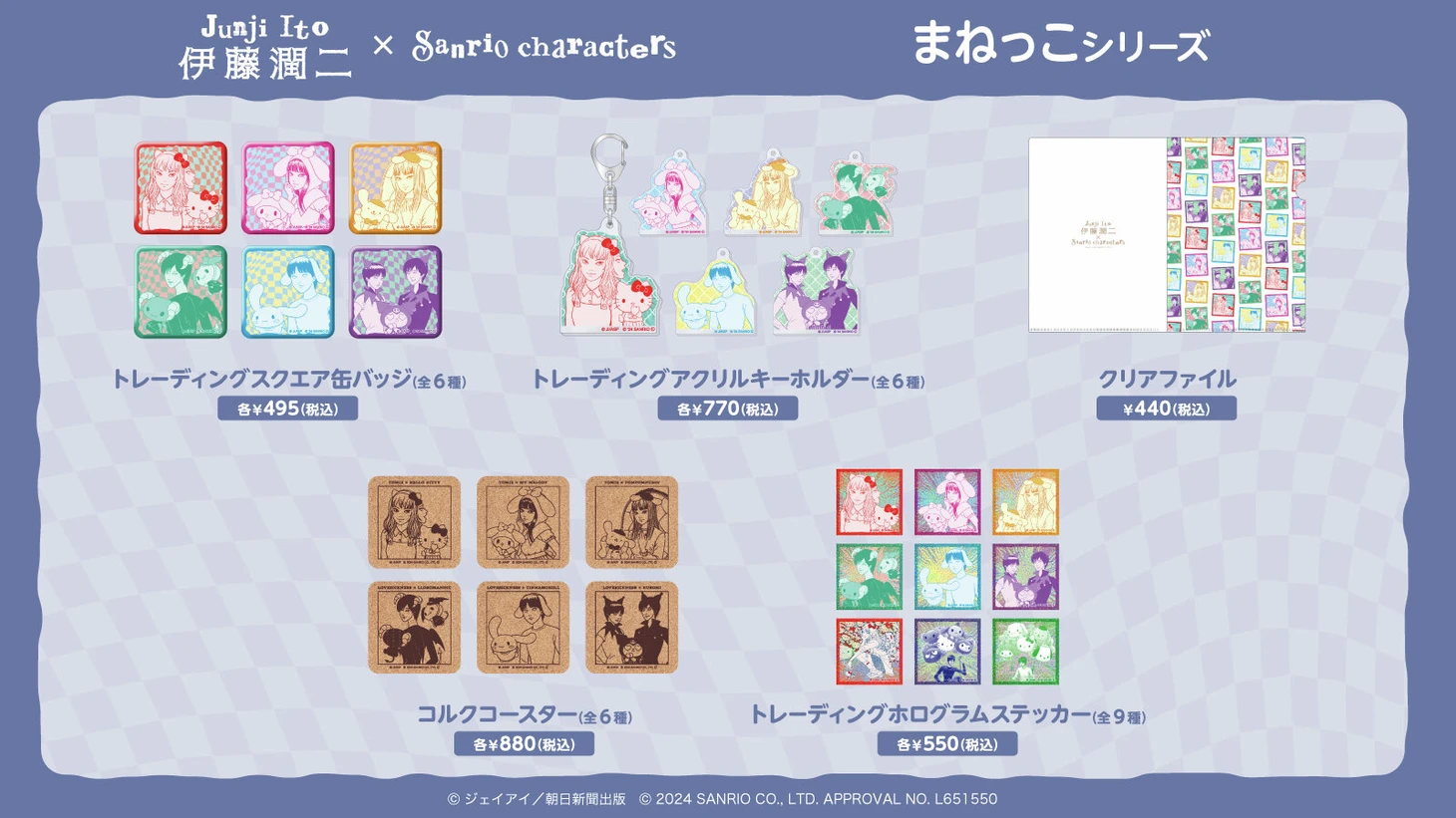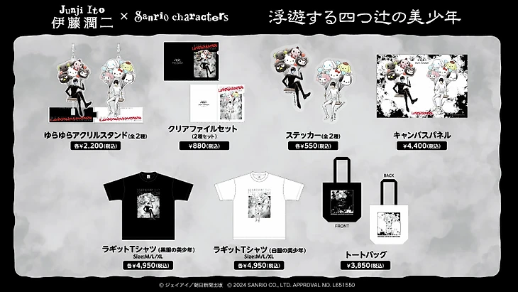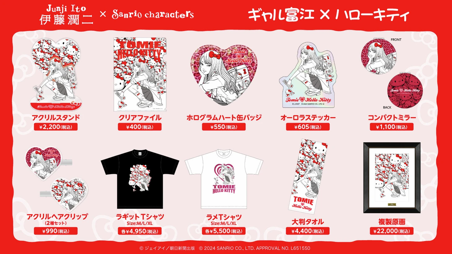 Лицом линейки с Hello Kitty стала притягательная роковая женщина Томиэ Каваками из одноименной манги. А еще герои коллекции страшных историй «Бессмертная любовь» – Рюсукэ Фуката и Красавчик с перекрестка, взявшие в руки тематические воздушные шарики. Сама Томиэ на арте Ито одевается в стиле субкультуры гяру, невероятно популярной в Японии. Комплект ее мерча, кстати, и называется соответствующе: «Gal Tomie» (где «Gal» – искаженный вариант английского «girl»). Включает в себя футболки, постеры, акриловые стенды, значки и многое другое.