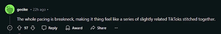 «Темп повествования головокружительно быстрый, от этого кажется, что серия – это набор слегка связанных между собой тиктоков, склеенных вместе».