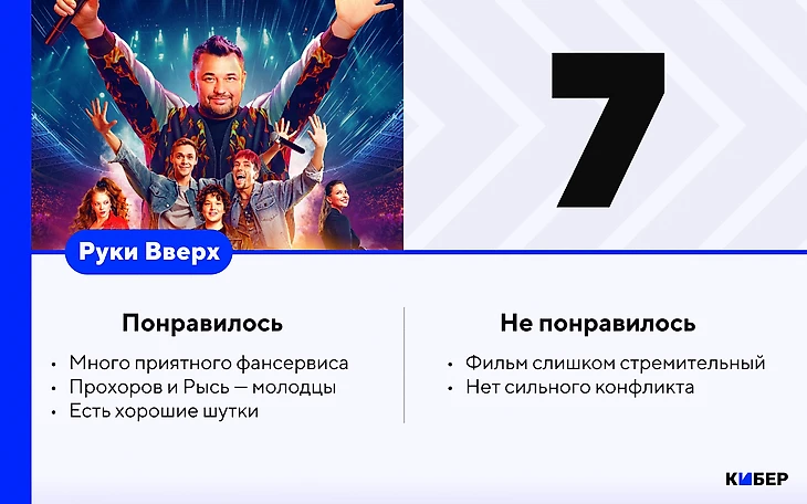 О фильме «Руки Вверх!» можно написать самую короткую рецензию в истории. «Если вы фанат Сергея Жукова, вам понравится». Отличная характеристика, учитывая, что среди фанатов – вся страна. Даже в 2024-м, спустя 30 лет с начала деятельности, Жуков выходит на сцену Лужников и видит 85 тысяч человек. Именно этой толпе стоит идти на сеанс.