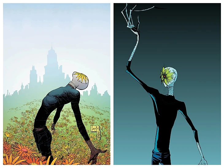Мистер Блум обладает леденящей душу внешностью, но еще больше пугает своими действиями. Когда читатель впервые знакомится с негодяем, он выглядит хрупким человеком в черном боди и с желтым цветком в центре белой маски – выглядит не так уж и грозно, не так ли? Но все изменилось, когда Блум обрел настоящую форму.