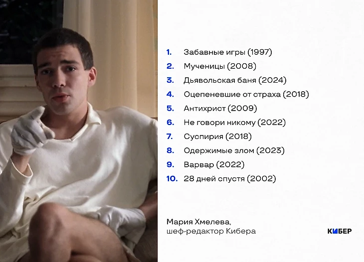 На первое место неслучайно попали «Забавные игры» 1997 года – это не совсем-то и хоррор: фильм издевается над зрителем сочетанием насилия и доброжелательности. Одни только диалоги делают его страшнее хайпового «Собирателя душ». Если морально не готовы смотреть 27-летний фильм, есть ремейк 2007 года с Наоми Уоттс и Тимом Ротом.
