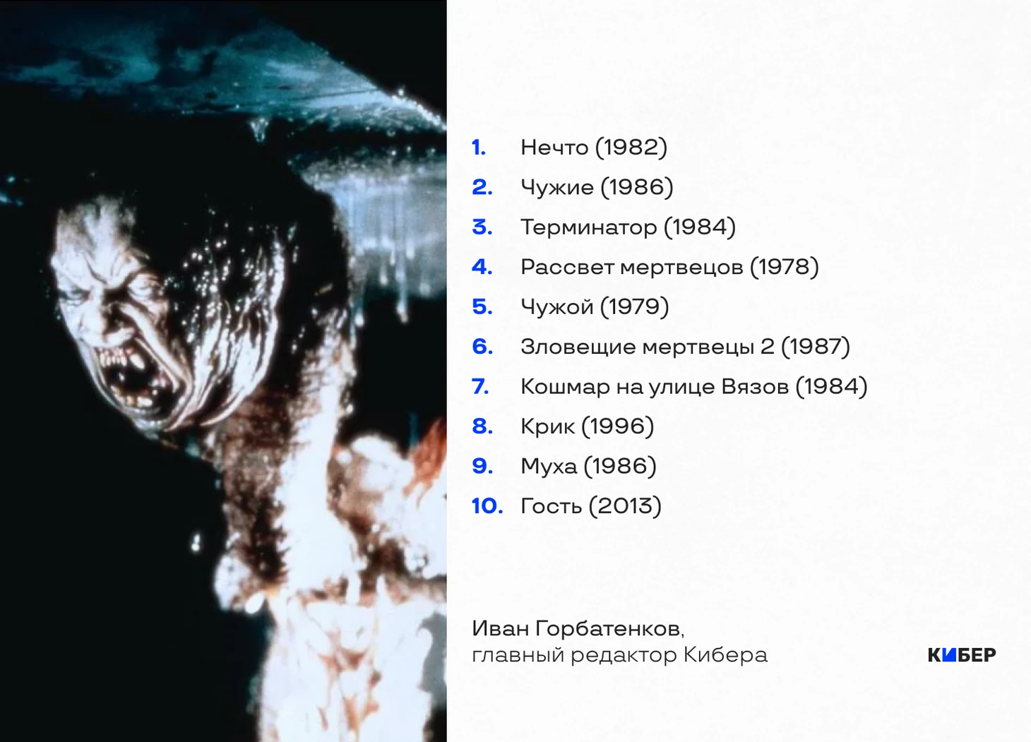 В топ-3 также вошли «Чужие» – который больше боевик, чем хоррор, но сохраняет некоторые элементы жанра. И первый «Терминатор», который сделан по абсолютно всем канонам слэшеров, но почему-то многими воспринимается исключительно как экшен.