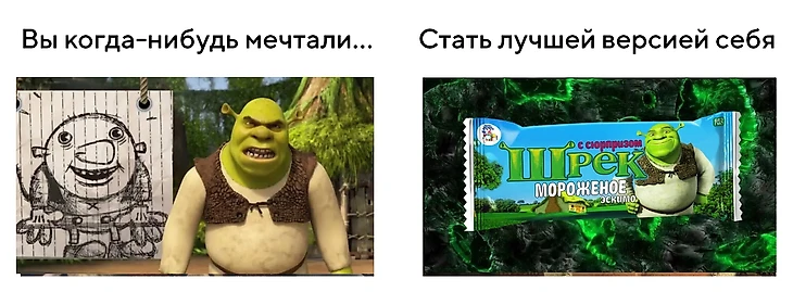Самый популярный мем с «Субстанцией» – сравнение двух картинок с подписью «Вы когда-нибудь мечтали стать лучшей версией себя?». Это фраза из начала фильма и трейлера: Элизабет смотрит видео с флешки, где рассказывается про экспериментальный препарат.