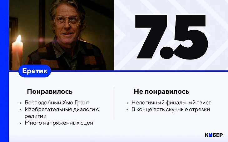 Жаль, что в отрыве от Гранта ничего великого в «Еретике» нет. Сюжет приятный, но местами нелогичный. Отлично держит в напряжении, но в паре мест хочется зевнуть. Финальный твист притянут за уши. В списке жанров числится хоррор, но жутких моментов почти нет.