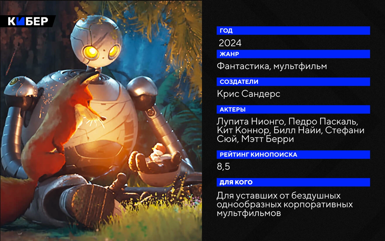 «Дикий робот» – феноменально слезливая картина о поиске себя и места в мире. Особенно чувствительные люди посмотрят ее только сквозь слезы, ребята покрепче сдадутся ближе к середине. Клишированный сюжет о пробуждении чувств в бездушной машине нисколько не мешает. Он лишь служит трогательным высказыванием о положении человека и человечности в мире, стоящем на стыке между природой и техническим прогрессом.