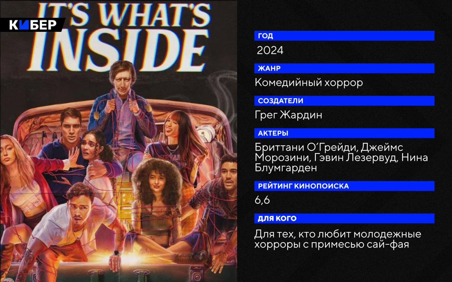 Знаете этот формат молодежных триллеров: парни и девушки съезжаются в дом по какому-то поводу (здесь – будущая свадьба одного из них), а там что-то происходит. То маньяк нападет, то съемки пойдут не по плану. В фильме «То, что внутри» сюжет двигает бывший одноклассник, которого давно никто не видел. У него есть волшебный светящийся чемоданчик (привет, Квентин!), который позволяет меняться телами. Компания сначала испугалась, потом обрадовалась и стала играть во что-то вроде «Кто я?» (когда бумажки ко лбу крепят) – только надо отгадать, кто в чьем теле. Конечно, что-то пошло не так.