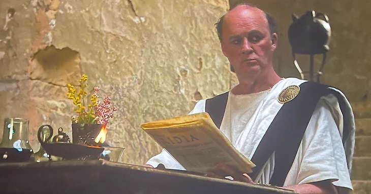 Пожалуй, самым смешным моментом стала сцена, в которой римский дворянин пьет чай в кафе за утренней газетой. Как отмечает профессор, действие фильма происходит примерно за 1200 лет до изобретения печатного станка в Германии 1440-х годов.