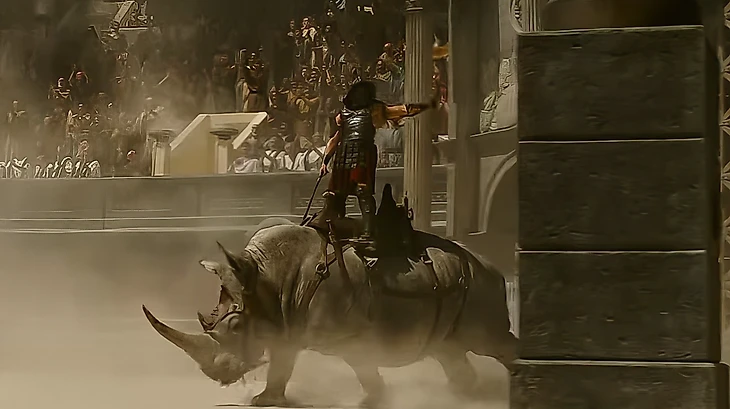 В одной из сцен «Гладиатора 2» Луций, персонаж Пола Мескала, сражается с врагом на огромном носороге. Вопросов нет, выглядит эпично! Но Кэтлин Коулман, профессор кафедры классической филологии Гарвардского университета, отмечает, что гладиаторы сражались с другими людьми, а не с животными: