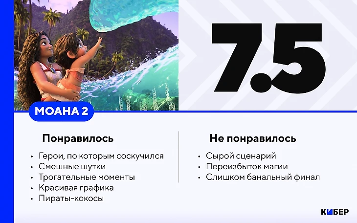 «Моана 2» – неплохой мультфильм и все-таки повод сходить в кино с детьми. Вы точно расслабитесь, получите дозу милоты и на пару часов забудете о повседневной суете, а ребенок вовсе будет счастлив. Но до высот оригинала сиквел не дотянется – разве что по кассовым сборам.