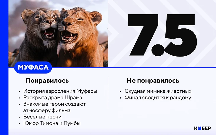 «Муфаса» – далеко не идеальный проект, но вполне заслуживает свое место в каноне. История переплетает в себе приключения любимых персонажей и задорные песни, а сюжет держит в напряжении до последних минут.