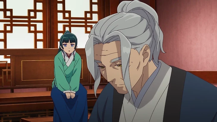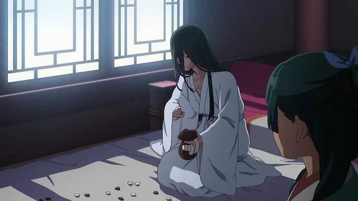 Когда Маомао становится личной служанкой наложницы и выходит в свет, она надевает красивое платье и наносит макияж. Так Женьши узнает, что ее веснушки ненастоящие – девушка ежедневно наносит на лицо грязь, чтобы стать максимально непривлекательной для мужчин. Она рассказывает, что даже веснушки не помогли, когда ее похитили.