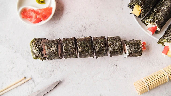 4.1. Если вы используете листы нори: порвите их на небольшие полоски и слегка обжарьте на сухой сковороде, чтобы раскрыть вкус, или просто нарежьте перед подачей.