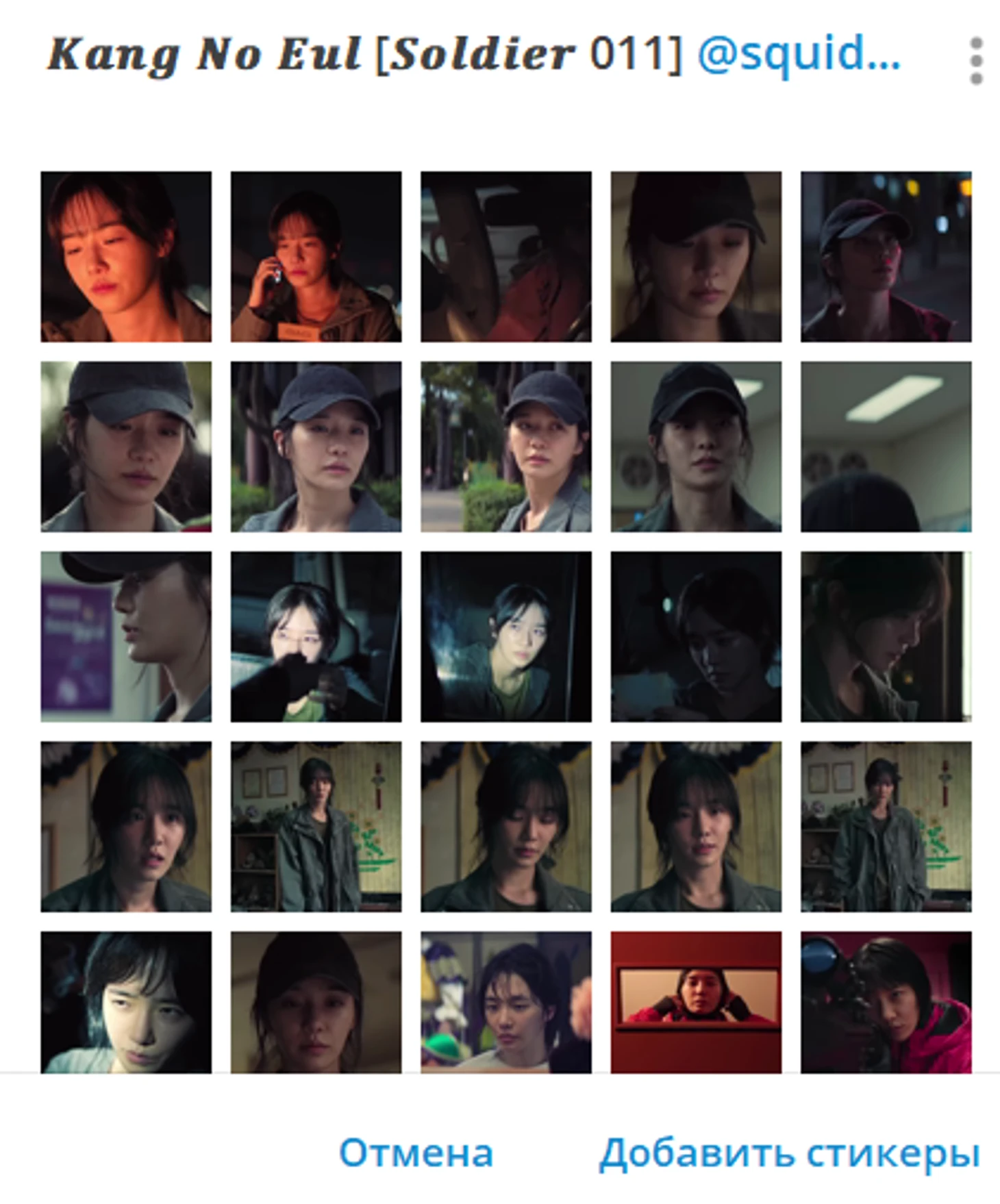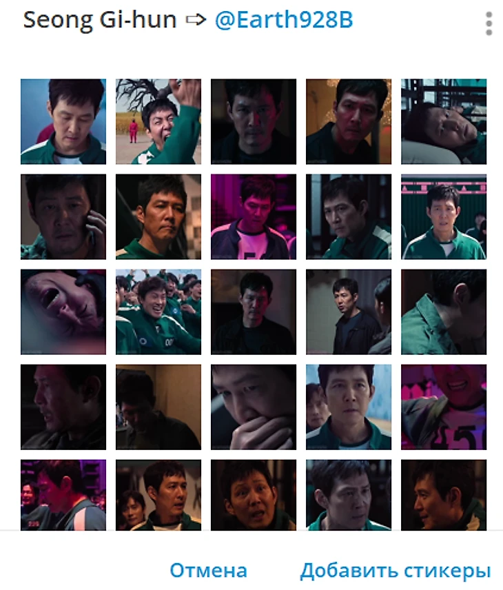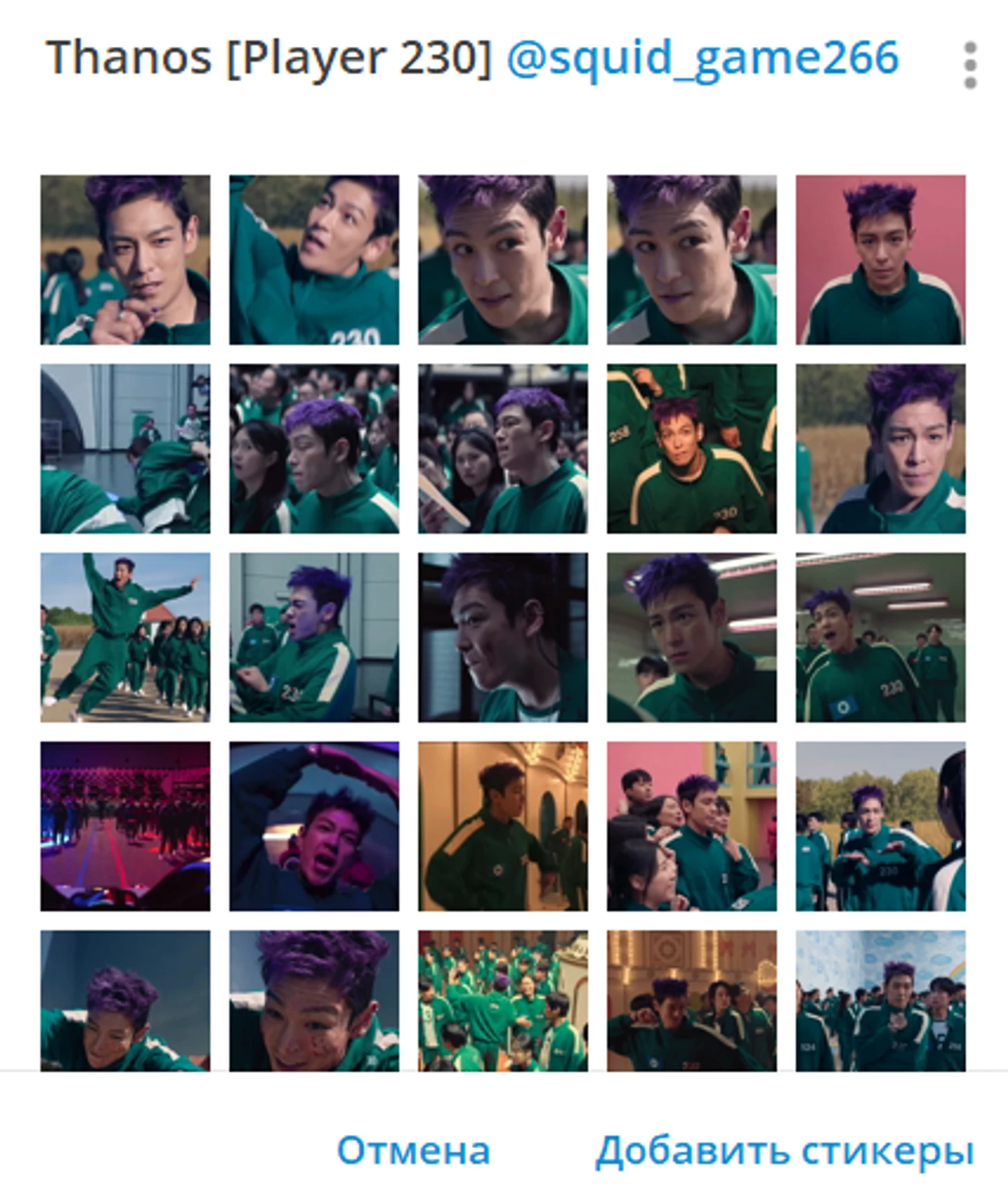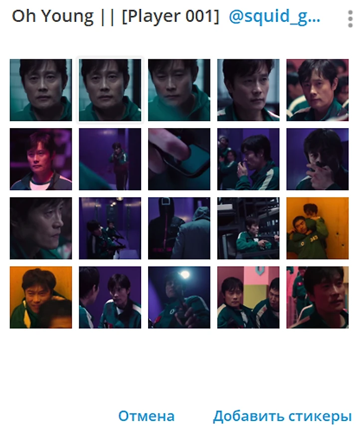 Достаточно перейти по ссылке в телеграм и нажать на кнопку «добавить». Вариантов стикерпаков большое количество как из первого сезона, так и со второго. Можно выбрать различных игроков, охранников, персонажей, которые не были непосредственно задействованы в игре.
