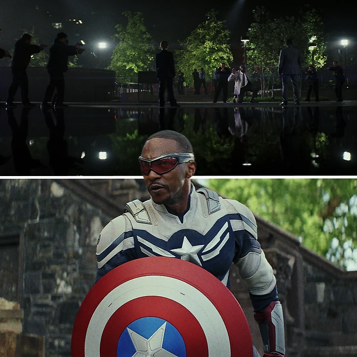 Также повторили привычную связку Капитана Америки и Сокола, новым ассистентом Кэпа стал Хоакин Торрес (Дэнни Рамирес). На экране привычно хромающая CGI-графика, а фильм начинается с экшен-сцены – классика проектов Marvel..