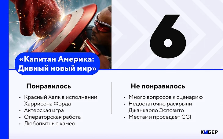 Новый фильм о Капитане Америке нельзя назвать плохим. В истории нет глобальных противоречий, на ведущие роли приглашены яркие актеры, в сценах поставлена неплохая боевка, а Красный Халк – украшение проекта. Но сюжет играет с чувствами зрителей слишком осторожно, будто боится что-то испортить.