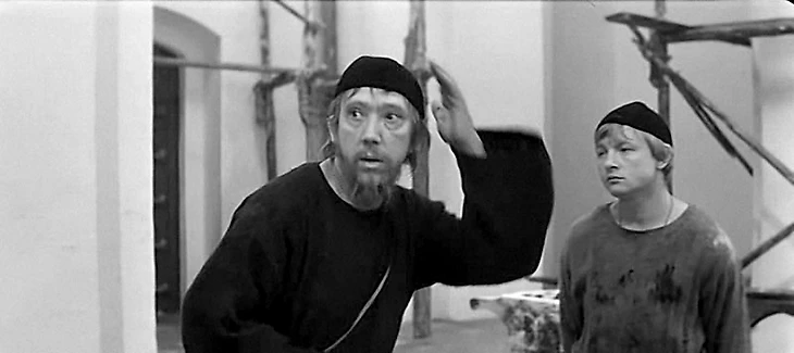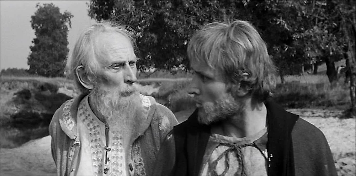 Начинается ливень, путники бегут в поисках укрытия. В это время в большом хлеву народ потешает скоморох (Ролан Быков). Он остер на язык и в своих скабрезных частушках высмеивает бояр. Публика благодарна и угощает артиста. На пороге монахи. Они просят впустить их переждать грозу. Никто не против. Скоморох не упускает случая подшутить над монахами. Вскоре появляются дружинники. Сначала они бьют скомороха головой о дерево, а затем, потерявшего сознание, увозят с собой. Дождь прекратился. Андрей и Кирилл будят задремавшего Данилу (Николай Гринько), чтобы продолжить путь.