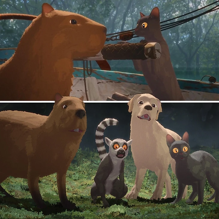 В анимационном фильме «Поток» рассказывается история о жизни черного кота в мире постапокалипсиса. Человечество куда-то исчезло, а планету накрыл всемирный потоп. В попытках спастись кот встречает лабрадора, капибару, лемура, большую птицу и подобие кита.