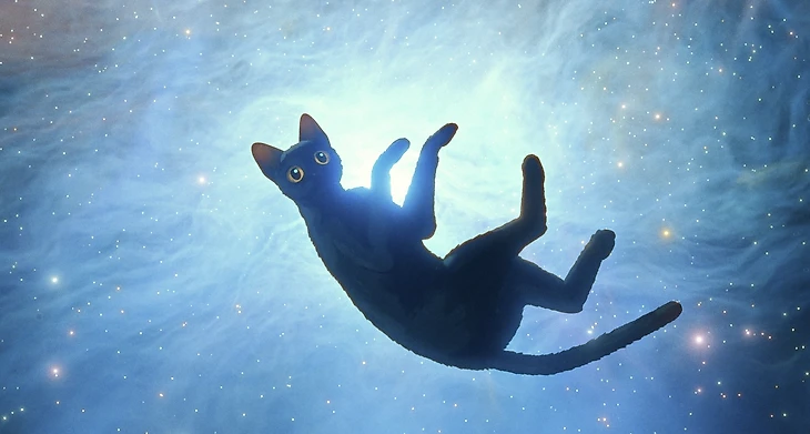 Во время шторма птице-секретарю удается улететь и покинуть лодку. Когда кота выносит на берег – он следует за птицей на вершину каменного столба, где их обоих поглощает космический свет. Он подхватывает их в невесомость, но в итоге забирает лишь птицу.