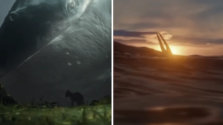 Незадолго до финальных титров зритель наблюдает грустную сцену с китом, который был помощником кота во время наводнения. Когда вода ушла, он не успел уплыть и теперь лежит на суше. В его глазах отражается принятие скорой смерти. Но в сцене после титров мы видим, что кит жив: он плавает в воде!