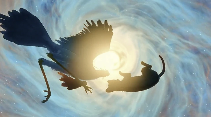 Позже, на вершине показали, как космос подхватывает героя в невесомость – духи будто готовы забрать его к себе. Но птица решает занять его место. Она знает, что не выживет со сломанным крылом, поэтому жертвует собой ради друга. Возможно, наводнение отступило в том числе благодаря такому поступку.