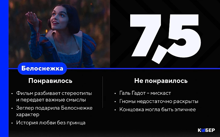 Новая «Белоснежка» – не идеал, но и низких рейтингов не заслужила. Дайте ей шанс, а еще лучше – покажите детям и спросите их мнение. На выходе из кинотеатра я сперва заметил пару тусклых взрослых глаз, а через мгновение – абсолютно счастливых мальчишек и девчонок. Значит, магия сработала. Значит, не все потеряно.