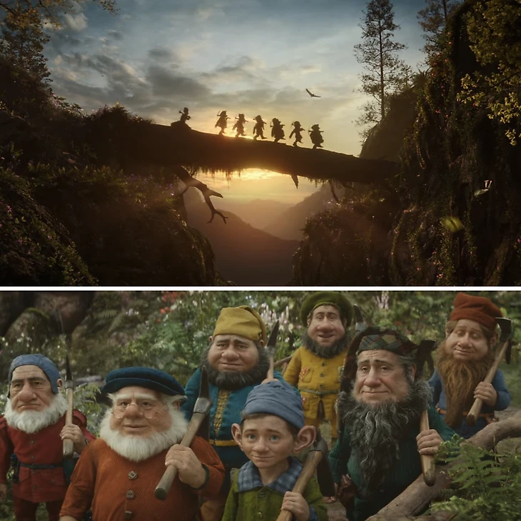 Семеро гномов похожи на мультяшных – большими носами, разными характерами и забавными моментами. Их каноничная песня тоже на месте! Но в этот раз роль гномов чуть больше, чем добыча сокровищ, познание основ гигиены и оплакивание Белоснежки.