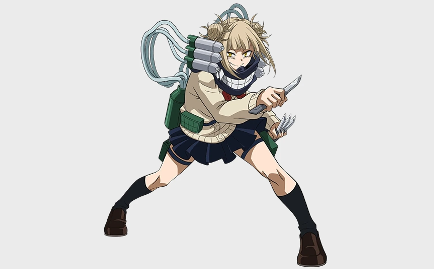 Химико Тога – 17-ти летняя злодейка ростом 157 см и уникальной Причудой «Метаморфоза». Способность позволяет принимать облик любого человека и даже имитировать голос после того, как она выпьет его кровь. Химико – жизнерадостная и всегда улыбающаяся девушка, даже в самых мрачных ситуациях, что делает ее характер особенно ярким. Несмотря на игривую натуру, она чувствует смущение, когда люди видят ее голой после использования способности. Обладая умением пародировать поведение жертв, она всегда готова к действию, используя небольшой нож и специальный аппарат для выкачивания крови, что делает ее опасным противником в бою.